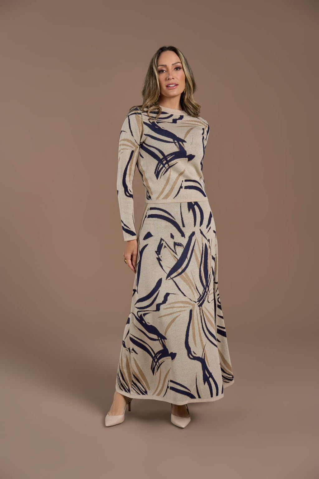 A Saia Longa é uma expressão de personalidade e fluidez. Com seu design exclusivo e estampa em tons de azul e avelã, esta peça é perfeita para adicionar um toque de sofisticação e cor ao seu guarda-roupa.